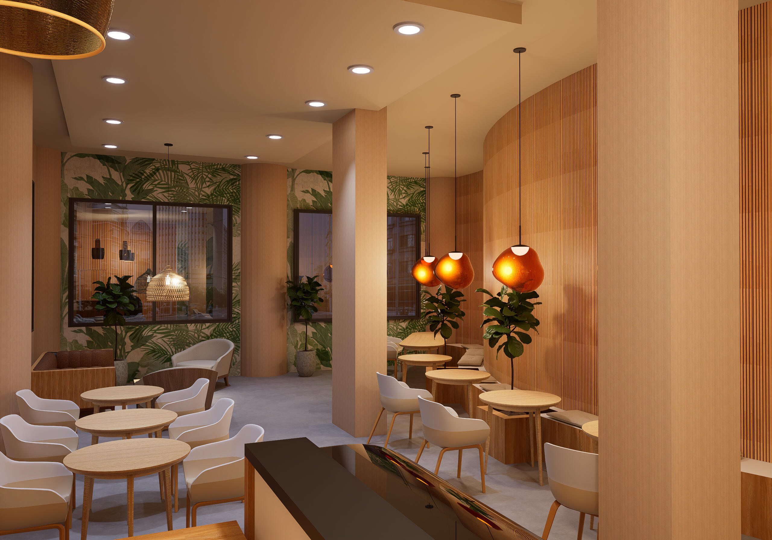 Guru Café se-t-enn cafe ek lounge, situe dan enn lotel business hotel a Quatre-Bornes, Moris. Design final la servi bann kouler natirel, texture boisé ek enn l’éclairaz stratezik pou kree enn lanbians akeyan ek sofistike. Bann sez bien amenaze pou adapte a bann diferan group, ek osi finn integre bann eleman design biophilique finn pou aport enn touche natirel ek zen. Konsepsion la osi kree enn lien viziel avek hall lotel la pou asir enn tranzision fluid.